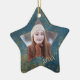 L'avant de cet ornement en forme d'étoile tient la photo de votre diplômé dans un cadre qui correspond à la forme de l'ornement. L'année d'études supérieures est en or en bas à droite de la photo, et tout est encadré d'un faux marbre bleu et motif de parties scintillant or. Le dos de l'ornement a le même arrière - plan, avec l'étoile centrale tenant votre texte personnalisé en or foncé. Un beau souvenir pour tous les diplômés !