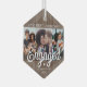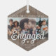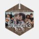 Célébrez le 1er jour férié joyeux de votre fiançailles avec un collage photo personnalisé 3 "Our First Christmas Engaged" en forme d'hexagone ornement en verre. Toutes les formulations et images de ce modèle sont simples à personnaliser. (CONSEIL EN MATIÈRE DE PLACEMENT D'IMAGE : Une façon simple de centrer une photo exactement comment vous voulez est de la rogner avant de la télécharger sur le site Zazzle.) En tant qu'idée, la typographie de script peut lire "Ensemble" ou "Marié". Le design moderne de la ferme comprend du faux bois brun rustique, de la calligraphie élégante, les noms et l'année du couple, et trois photos de votre choix. Cette tenue mariage unique ajoute une touche élégante à la décoration de la maison de Noël.