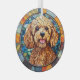 Voici un joli ornement en verre sur le thème du vitrail, avec un adorable chien de caniche abricot. Le chien est dressé contre un arrière - plan à prédominance bleue avec une bordure en or. Cela fait un bon rembourrage ou la décoration pour la maison qui aime un caniche.