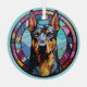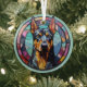 Voici un joli ornement en verre avec un thème de vitrail, avec un beau chien Doberman Pinscher. Le chien est dressé contre un arrière - plan en mosaïque multicolore. Les couleurs sont le bleu, l'or, le rouge marron et le rose lavande. Cela fait un bon pochette ou décoration pour la maison qui aime un majestueux Doberman.