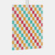 Alternating red, orange, teal, and white squares create a colorful, vibrant checkerboard pattern, conveying an energetic and playful tone.
