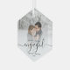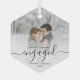 Commémorez votre fiançailles avec ce magnifique ornement de gardien moderne. Le texte noir indique "Notre premier Noël engagé", avec le mot "engagé" dans un élégant script d'écriture manuscrite avec des fioritures avant et après. Remplacez l'exemple d'image par votre photo préférée, et ajoutez vos noms et l'année. Un filtre dégradé blanc permet de faire apparaître le texte.
