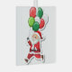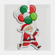Illustration d'un dessin animé du Père Noël courant avec un tas de ballons, les ballons sont rouge, vert et blanc, Père Noël est blanc, environ 70 ans, avec cheveux et barbe blancs, portant un costume rouge avec garniture de fourrure blanche et une ceinture noire, l'illustration est sur un ornement carré blanc avec un ruban blanc en haut.