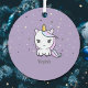 Un ornement de Noël pourpre avec une mignonne licorne en couleur pastel, un prénom personnalisable, un arrière - plan pois et une autre licorne sur le dos. Parfait pour votre décoration de Noël !