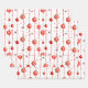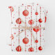 Ce papier d'emballage présente un motif répétitif d'ornements de Noël rouges et blancs accrochés à des cordes verticales de perles rouges. De petites étoiles rouges stylisées parsèment l'arrière - plan blanc. Certains ornements sont en rouge massif, d'autres en rayures rouges et blanches.