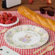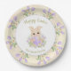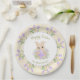 Osterbrunch & Eierjagd Teller mit dem niedlichen Osterhasen mit Ostereier in lila und grün. Kleiner Tulpenstrauß an der gelben Kante. Einfache Personalisierung des Textes - Kate Eden Art.