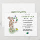 Der Osterhase jongliert die Ostereier, während das kleine Huhn das Publikum ist.