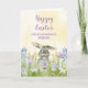 Glücklicher Osterfreund grüßt Karte mit einer niedlichen Abbildung eines Osterhasen auf einer Frühjahrswiese mit Aquarellfarben-Blume.