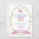 Ostereier Jagd Einladung mit Pastellfarben und hübschen blumenreichen ovalen Kranz und sonnigen Ohren.