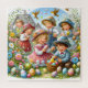 Kinder in einem Garten voller blühender Blume, die lebendige Ostereier sammeln. Eine fröhliche Frühlingsfeier.