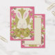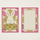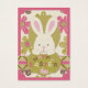 Osterhasen, der aus Punktdrucken mit floralem Hintergrund herausguckt.Ostergeschenk-Tag.