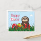 Fröhliche Osterwünsche mit einer Drehung! Ein niedlicher Schlamm, der große bunte Ostereier umarmt, für eine entspannte und entspannte Atmosphäre. Auf der anderen Seite der Postkarte befinden sich zwei Kawaii Ladybugs, wo die Wünsche liegen. Eine farbenfrohe, wirklich aufziehende Karte! Die Nachricht kann angepasst werden. Ideal für alle Altersgruppen und Konfessionen!