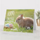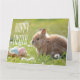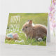 Ein niedlicher Osterhasen mit einem kleinen Korb pastellfarbener Eier ist hier, um Ihrer Familie und Freunden ein glückliches und fröhliches Ostern zu wünschen.