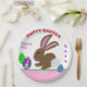 Glückliche Ostertypografie in rot. Hippity Hop und Liebe in lila Farbtext. Frühling in Ostern geschrieben in Weiß am Boden gegen hellrosa und grüne Streifen Hintergrund, Niedlich braunes Hasen mit großen rosa Ohren. Grüne, blaue und grüne Ostereier. Original Artwork Design © 2016 TamiraZDesign.