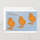 Eine Vintage, antike Osterpostkarte mit drei schwammig gelben Filzkichern in Folge. Hintergrund in blau. Frohe Ostern!