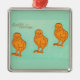 Eine Vintage, antike Osterpostkarte mit drei schwammig gelben Filzkichern in Folge. Hintergrund in blau. Frohe Ostern!