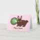 Niedliche Osterkarte mit einem Nest farbiger Eier auf einem grünen Strohbett. Ein schokoladenfarbener Hase, der sie bewacht.