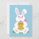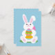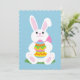 Ein niedlicher Osterhase mit einem rosa Bugband, das so glücklich auf Ostereis gehalten wurde, das in Frühlingsfarben mit Süßigkeiten geschmückt ist, die auf einem grünem Gras mit einem robineneiblauen Hintergrund sitzen. Schicken Sie diese geschossene Randeinladung, um Leute für eine Ostereisjagd zu einem kleinen Jungen oder Mädchen, einem großen Jungen oder Mädchen, einer Familie oder einem Freund für ein himmlisches Happy Oaster einzuladen.