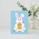 Ein niedlicher Osterhase mit einem rosa Bugband, der so glücklich am Ostereier festhält, der in Frühlingstönen mit Süßigkeiten geschmückt ist, die auf einem grünen Gras mit einem robinfarbenen Hintergrund sitzen. Schicken Sie diese Postkarte an ein kleines oder großes Mädchen oder eine Familie oder einen Freund, um ihnen ein glückliches Ostern zu wünschen.