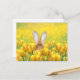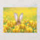 Flämisches riesiges Häschenkaninchen verlor in der gelben Tulpeentweder Jagd für oder in versteckender niedlicher Feiertagspostkarte Ostereier