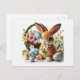 Ein niedliches Foto des Osterhasen zwischen Blume und Eiern
