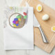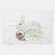 Küchentücher mit einer originellen Abbildung eines realistischen Kaninchens und farbenfroher Korb von Ostereiern.