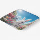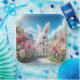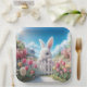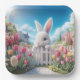 Ein niedliches Osterhasen, flüchtige Blicke über einen Haufen Zaun, umgeben von farbenfrohen Tulpen und einem hellen Frühlingsgarten.