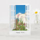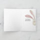 Offenes Fenster und schiere Vorhänge Blick auf niedlichen Osterhasen im Gras und Blume für Ostergrüße