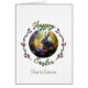 Ein kleiner Osterhasen versteckt sich auf einem Feld neben seinem Ostereikorb. Er ist in Happy Oaster Text beschämt. Ihre Familie grüßt unten.