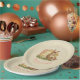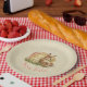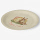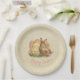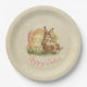 Diese Teller aus dem Ostersonnigen bieten ein wunderschönes Aquarell gemalt Kaninchen, das sich gegen hübsche Ostereier aufsetzt. Typografie auf der Vorderseite sagt "Happy Oaster unter ihm" in einem dunkelpeachy rosa mit einem weißen Rand. Der Hase ist Set vor einem Imitat Leinen blassgelben Hintergrund.