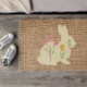 Doormat mit der hellen Silhouette eines Osterhasen mit Frühlingsblumen im Burlap-Look Hintergrund . Toll auf jeder Zuhause für eine rustikale Frühlingsdekoration . Design von Alma Wad .