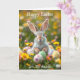 Personalisiert Osterhasen Osterkarte mit Innenseiten. Niedlicher Hasen im Gras voller Blume und Ostereier.
