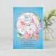 Diese festliche Ostern-Einladung kennzeichnet ein weißes Häschen mit einem Frühling-Blumenhintergrund und verzierten Ostereiern gegen einen blau-gesprenkelten Hintergrund.