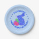 Blaues Themed Geburtstags-Party-personalisierte kundenspezifische kleine Papierplatte Osterhasen-Osterei-buntes Kaninchen-Spaß-Ostern. Kann besonders angefertigt werden, um die Hintergrundfarbe zu ändern und/oder einen Namen, Initialen oder Spaßmitteilung zu addieren. Dieser Osterhase mit Ostereiern ist kein Peter-Waldkaninchen. Hell und voll von der Farbe, ist er der Ostern-Korb, das farbige Gras und die Geleebonbone, die ganz oben in einem gerollt werden und passt über seinen Juweltoneiern auf. Spaß-Osterhase mit Ostereiern, die in meinen Scheiben der Farbart, diese bunten Symbole des Frühlinges getan werden, sind zu einem glücklichen Ostern-Feiertag bereit. Häschen-Kaninchen getan in den Schatten des Blaus mit lila, rosa und grünen Ostereiern.