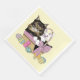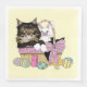 Niedliches Tabby mit langem Haar Kätzchen sitzend in einem Osterkorb mit einem rosa Hasen und einem ausgestopften Osterhase. Ostereier rund um den Korb.