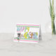 Umfassen Sie Bild Ohren und des Haltens eines der tragenden Häschens des Mops eines Ostern-Korbes mit bunt verziertem Ei. Innerer kundengerechter Text liest: "Mai wird Ihr Ostern im Glück eingewickelt und gebunden mit Liebe".