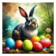 Graues und weißes Osterhasen mit bunten Ostereiern.