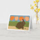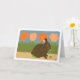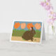 Dieser niedliche Hase ist schuldig, die Pflanze im Garten zu essen. Braunes Hasen vor der grünen Hecke mit Tulpen und Himmel im Hintergrund. Das Bild sieht aus wie handgemaltes Papier. Verwenden Sie für Frühjahr Equinox, März equinox, den ersten Frühlingstag, Ostern, Vernal Equinox, und Mutter Erde. Braun, pfirsichfarben, grün, braun und rosa. Innen: Leere