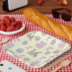 Teller mit Süßspeisen und ihrem Ostereier, Osterkorb und Blume.