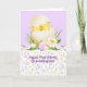Erste Osterkarte für Großtochter mit Blume unten und Lavendel oben mit einem kleinen Küken, das aus einem Ei herausguckt, und "Happy First Oaster Grandtochter" in lila am Boden. Einige originelle artwork©delightful-doodles.com