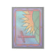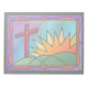 Ein buntes Glasdesign, das den Ostermorgen illustriert, mit einem roten Kreuz, das auf grünen Hügeln neben einem feurigen Sonnenaufgang stehend ist.