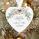 Inspirational personalized Our First Christmas as Mr & Mrs Ornament depicts a beautiful vintage watercolor design with two pink roses and greenery. The back features the first names, date and a Christian quote, "Two lives united in friendship, Two friends united in love, One love united in Christ." *