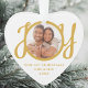 This keepsake heart-shaped First Christmas Engaged photo ornament is decorated with the word JOY in stylish gold script typography. Easily customizable.