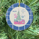 Un adorable premier ornement de Noël avec une illustration rétro fantaisiste de deux oursons polaires décorant un arbre pour les fêtes à l'avant et un motif en grille bleu et crème à l'arrière. Personnalisez-le avec le nom de l'enfant et l'année. Vous pouvez également ajouter une photo de bébé à l'envers en utilisant l'outil d'édition. © ArianeC Illustrations-Tous droits réservés