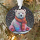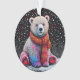 Ours polaire assis contre un arrière - plan sombre et étoilé. L'ours est rendu dans un motif coloré à la pointe qui lui donne un aspect ludique et fantaisiste. Il porte une écharpe orange vif qui ajoute de la chaleur à la scène. Le sol enneigé sous l'ours est également illustré d'une texture pointillée, et les étoiles et points colorés qui l'entourent créent une atmosphère festive et hivernale. L'ensemble est lumineux et gai, mêlant éléments de la nature et expression artistique.