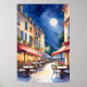 Das Poster eines hellen Vollmonds, eine bezaubernde Straße mit gemütlichen Cafés und lebhaften Blume ist beleuchtet und lädt zum Verweilen ein. Der gepflasterte Weg ist mit Tischen und Stühlen im Innenhof geschmückt, was eine ruhige und romantische Atmosphäre schafft.