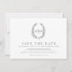 Ovaler Kranz von Blätter Hochzeit Foto Save the Date Karte in Weiß und Mitte Grau. Bearbeiten Sie diese Save the Date-Karte mit Ihren eigenen Namen und dem Hochzeitstermin auf einer Seite und Ihrem eigenen Foto auf der Rückseite. Weitere passende Elemente und Farboptionen sind verfügbar. Original-Blätter, gezeichnet und gestaltet von Sarah Trett für www.mylittleedenweddings.com