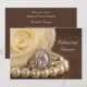 Das elegante Oval Diamond Ring und das White Rose Wedding Probe Dinner laden Sie zu einem Party ein, das Braut und Bräutigam würdigt. Dieses edle, nach Maß gefertigte botanische Hochzeitsdinner lädt mit einem nahen Blumenfoto eines ovalen Schnitt Verlobung Ring, weißer Perlenhalskette und weißer Rosenblüte auf braunem Seidenhintergrund ein.