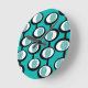 Diese Uhr hat ein modernes Design von Linien, die Kreise innerhalb von Ovalen bilden, die in Türkis, Schwarz und Weiß zusammengeschraubt sind.