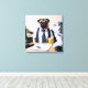 A pug dog in a business suit sits at a desk surrounded by a large stack of paperwork.